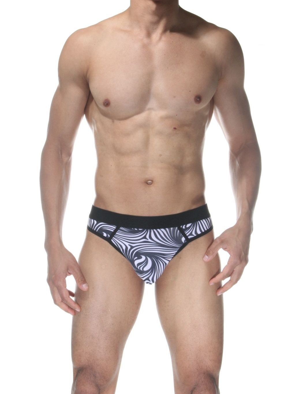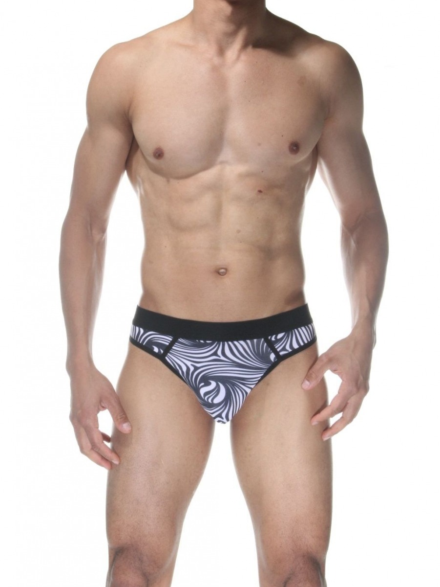 Бело-черные мужские трусы-стринги с абстрактным принтом.