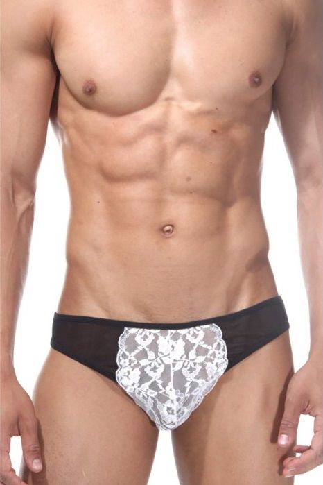 Черно-белые слипы для мужчин с низкой посадкой. На ягодицах и по бокам полупрозрачная черная тонкая ткань, а спереди белая вставка из кружева.