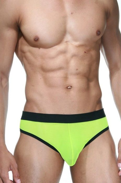 Ярко-зеленые мужские трусы-тонги на широкой черной резинке.