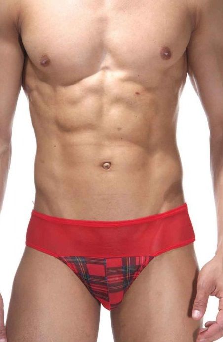 Мужские трусы-тонги, верх у которых сделан из тонкой полупрозрачной ткани, а низ из более плотной ткани в клетку.