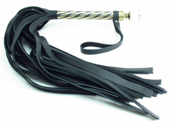 Плеть с широкими хлыстами и металлической ручкой. На конце ручки расположен крупный прозрачный кристалл.