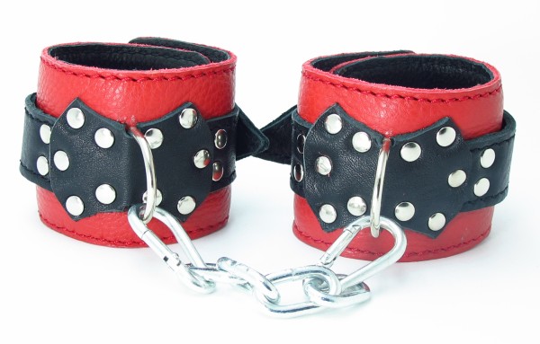 Красные наручники с чёрными проклёпанными ремешками с пряжкой. Ширина - 5 см.