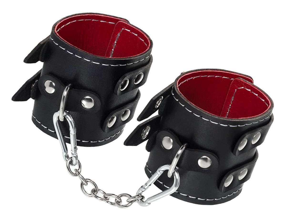 Эти кожаные наручники с двумя ремнями и красной подкладкой могут стать стильным аксессуаром, а могут послужить вашим целям по своему прямому назначению. Частичное обездвиживание и невозможность двигать руками дают вам полную власть над партнером – взрослые игры для взрослых. Наличие двух колец и карабинов, соединенных между собой металлической цепочкой, позволяет использовать изделие как раздельно – аксессуар-манжеты, так и как наручники для фиксации. К широким металлическим кольцам также можно присоединить и другие аксессуары при помощи карабинов. Благодаря универсальному размеру наручники могут использоваться и мужчинами, и женщинами. Размер легко регулируется с помощью металлических пряжек, органично вписывающихся в общий стиль. Длина манжет - 20 см, ширина - 7 см. Длина сцепки - 13 см.