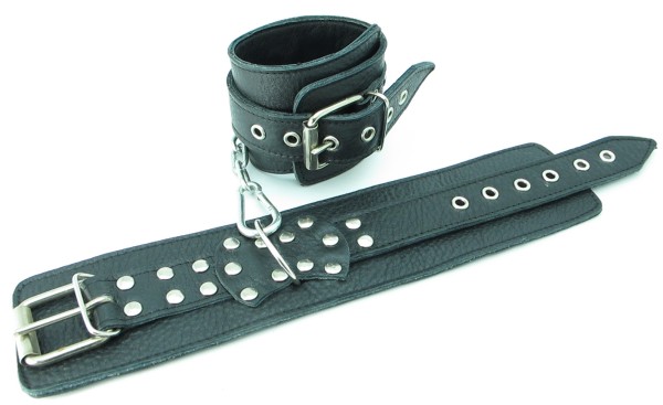 Кожаные наручники черного цвета. Украшены заклепками и соединяются между собой цепью с карабинами/ Размер наручников регулируется при помощи застежки Ширина - 6 см. Длина цепочки - 15,5 см.