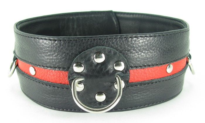 Черно-красный кожаный ошейник увеличенного размера с кольцом.