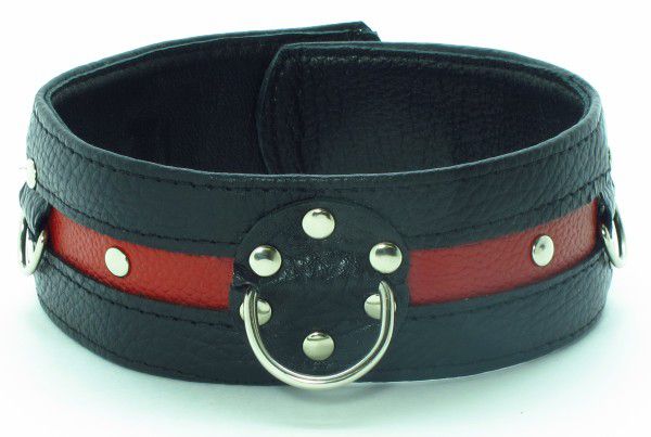 Стильный ошейник с красной полосой и металлическими заклепками обязательно понравится любителям БДСМ-игр. К пряжке можно пристегнуть поводок или наручники.