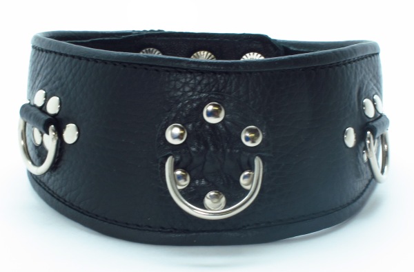 Чёрный кожаный ошейник с полукольцами и клёпками.