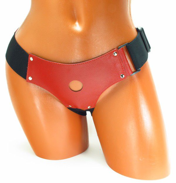 Трусики выполнены из натуральной кожи красного цвета с элементами из черных эластичных резинок, надежно фиксирующих изделие на теле.Ширина резинки на поясе 5см.Трусики джоки обеспечивают доступ к интимным зонам. Диаметр отверстия для страпона 2,5 см. Размер удобно регулируется, подойдет на 42-46. Максимально комфортный аксессуар разнообразит любую БДСМ игру.